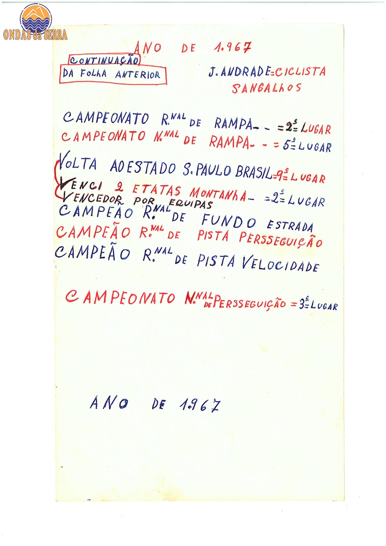 Em baixo estão inseridas cópias dumas folhas manuscritas à mão pelo ciclista, onde apontou com todo o cuidado, as provas em que participou, as classificações obtidas e prémios ganhos entre 1964 e 1971.