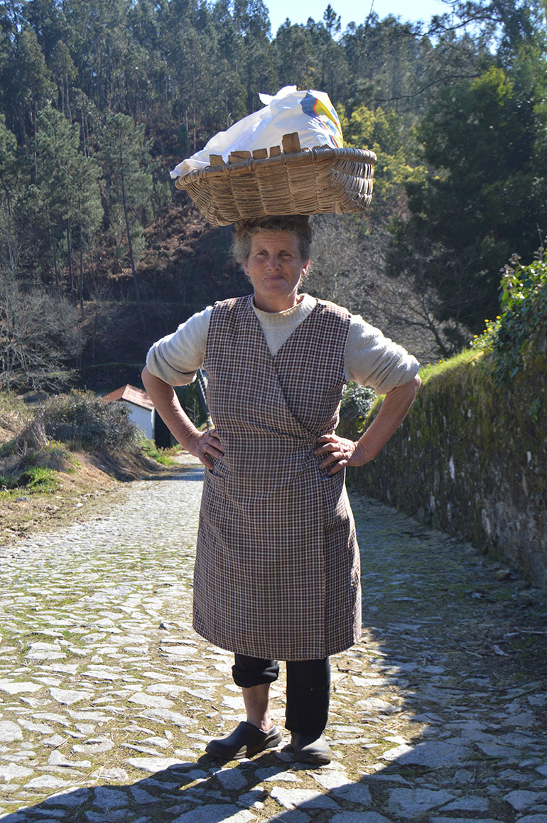 Ali perto junto a uma ponte, uma mulher que descia uma ingreme encosta, olhou para nós curiosa e continuou viagem. Retomamos a marcha e ao chegar ao cimo da encosta, vimos a mesma mulher a regressar com uma canastra à cabeça. Para melhorar o equilíbrio deste “aparato” e amenizar o peso usava uma rodilha improvisada com uma tolha enrolada. Este tipo de quadro já se vê raramente e embora seja bonito preservar as tradições, esta é uma daquelas que não ajuda muito a saúde da coluna vertebral de tão fortes mulheres. Esta mulher de nome Lurdes com 57 anos de idade disse ser padeira de profissão e habitante da aldeia de Damonde – freguesia de Travanca – Oliveira de Azeméis.
