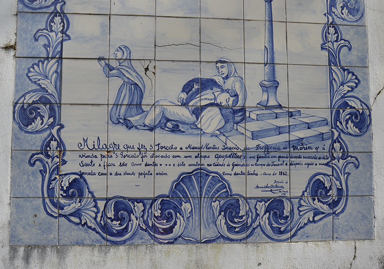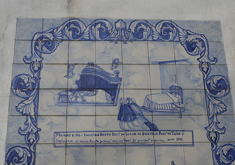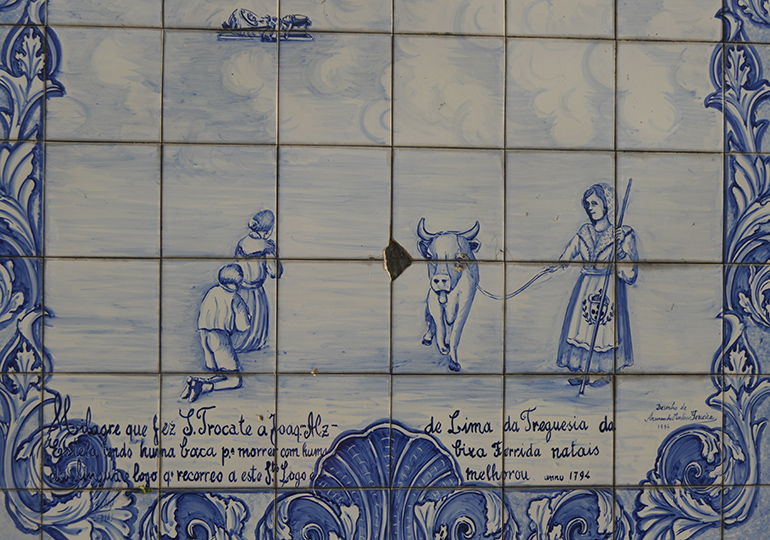 Espalhados pelas paredes das escadarias dos jardins deste santuário, vários painéis com azulejos remetem para a fé destas gentes com descrições dos milagres efetuados pelo santo, aqui fica uma das suas descrições: