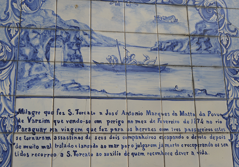 “Milagre que fez S. Toracato a José António Marques da Matta da Povoa do Varzim que vendo-se em perigo no mez de Fevereiro de 1874 no rio Paraguay” na viajem que fez para os hervaes com três passageiros estes se tornaram assassinos de seus dois companheiros escapando o devoto depois de muito mal tratado e lançado ao mar por o julgarem já morto e recoperando os sentidos recorrendo a S. Torcato ao auxilio de quem reconhece dever a vida.”